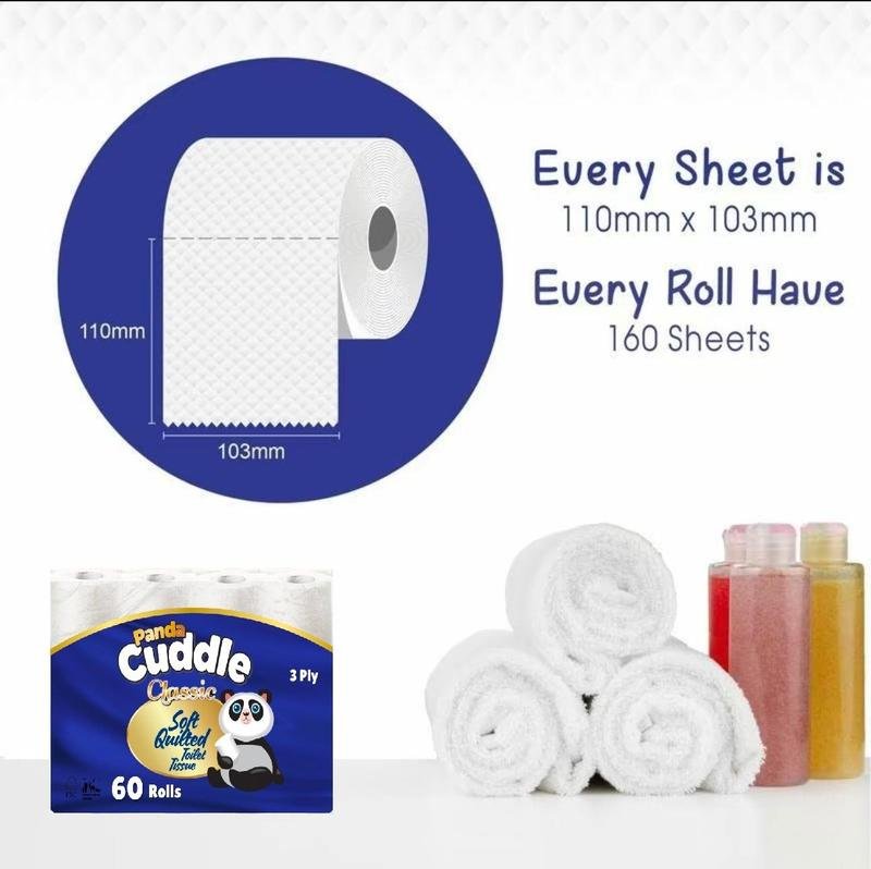 Introducing a bulk buy of 120 rolls of high-quality toilet tissue paper. Each roll contains more than 150 sheets of 3-ply quilted paper, ensuring maximum comfort and durability. The cuddle panda brand promises an exceptional experience, with a non-scented feature that makes it suitable for all users.