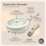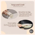 The detachable handle adds a new level of flexibility to your kitchen routine. Easily snap on the ergonomic handle for comfortable cooking. then detach it with a simple click when it’s time to transfer your dish to the table or store the pan in a compact space. Say goodbye to bulky handles and awkward storage solutions – with SnapChef. you can enjoy effortless cooking and convenient storage without sacrificing quality or performance.